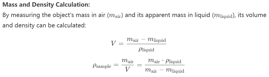With the addition of a glass sinker of known volume, the density kit can also be used for determining the density of liquid samples.